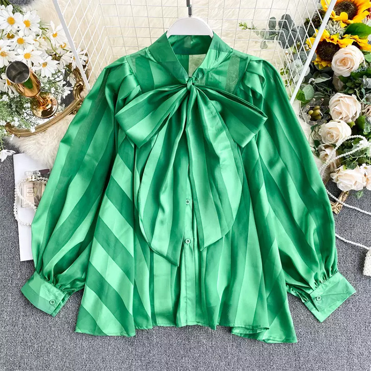 Women’s Fashion Puff Sleeve Bowknot Satin Blouse Green