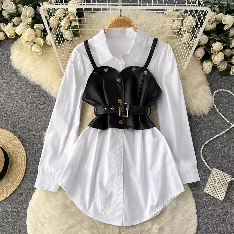 Women’s Leather Suspender Vest & White Long Sleeved Shirt Black