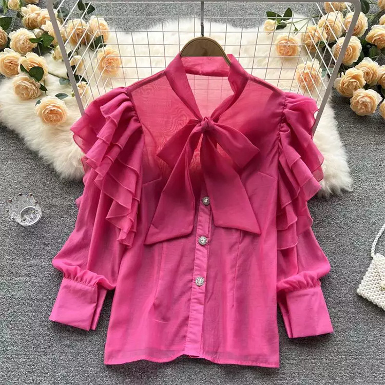 Women’s Ruffled Sweet Ties Loose Long-Sleeved Shirt Pink