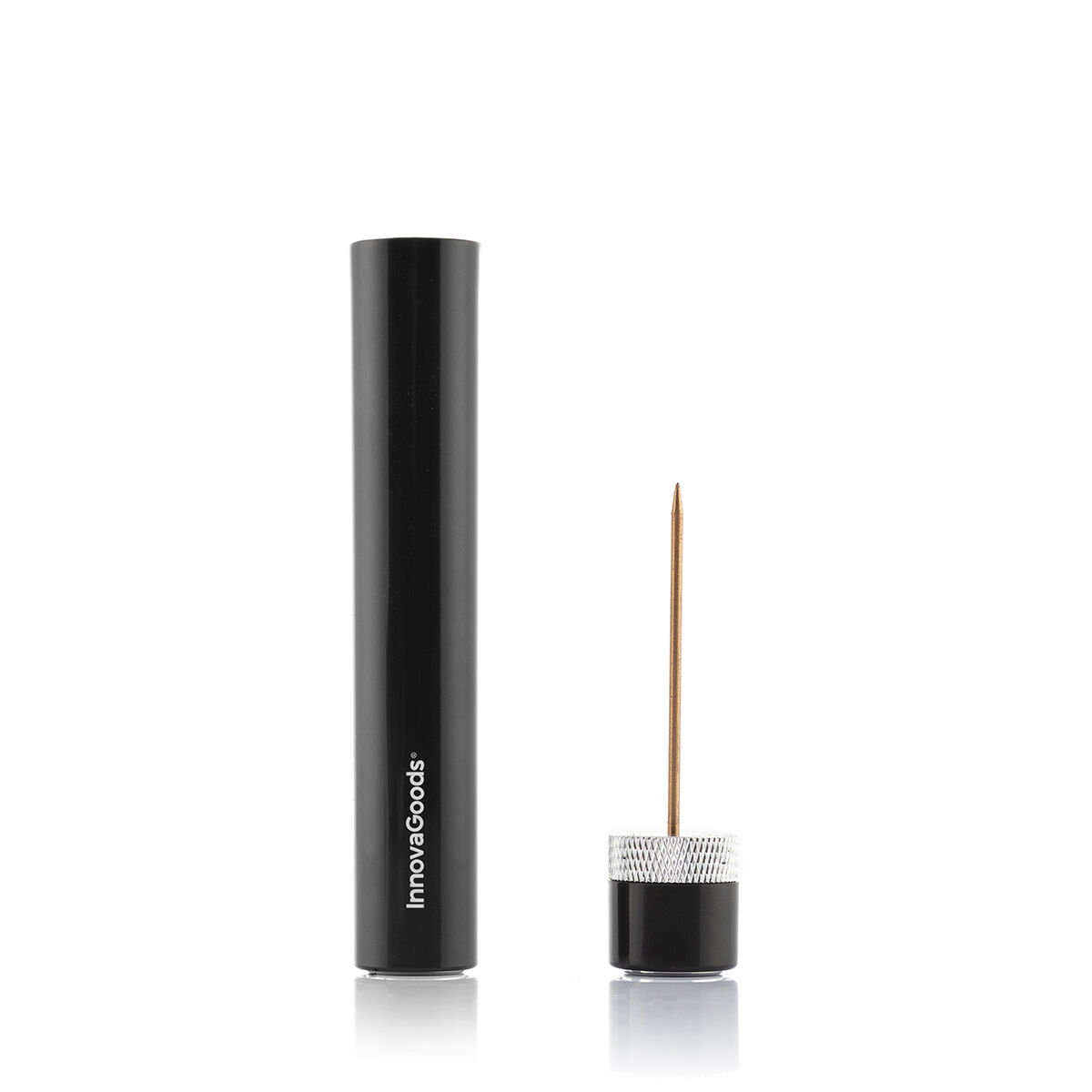 An air pressure corkscrew for wine which is ideal for opening bottles efficiently, quickly and conveniently, and prevents the cork from breaking. The original and elegant design makes it the perfect gift. This manual corkscrew is very lightweight and compact, it is similar in size to a pen, so it takes up very little space and can be transported anywhere and stored easily. It assembles and dismantles easily and includes instructions for use. It is simple to operate. Simply remove the magnetic lid, unscrew it from the base with the needle and pull that base with the needle to remove it completely from the body of the corkscrew. Then turn the base with the needle the other way round and screw it into the body of the corkscrew where the injector or air pump is located. Finally, fully insert the needle into the cork and exert pressure up an down, lifting and lowering the air injector several times, then wait a few seconds for the cork to be fully or partially removed. If necessary, slowly inject air a few more times until the cork comes out fully. The number of times required to activate the air injector depends on the bottle stopper material (cork or synthetic), how long the wine has been bottled for and the temperature of the bottle. The cork is removed using pressure, like when you open a bottle of cava, so you need to take care. Suitable for natural cork and synthetic bottle stoppers.